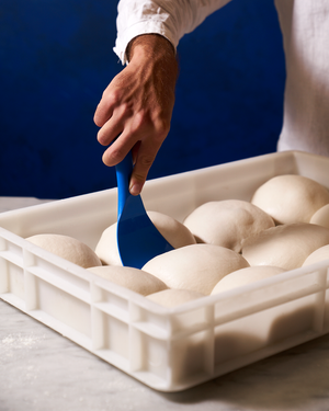 En spatel bruges til at løfte pizzadejboller op fra en hævekasse uden at punktere eller misforme dejen og uden at dejen klæber til dine hænder.